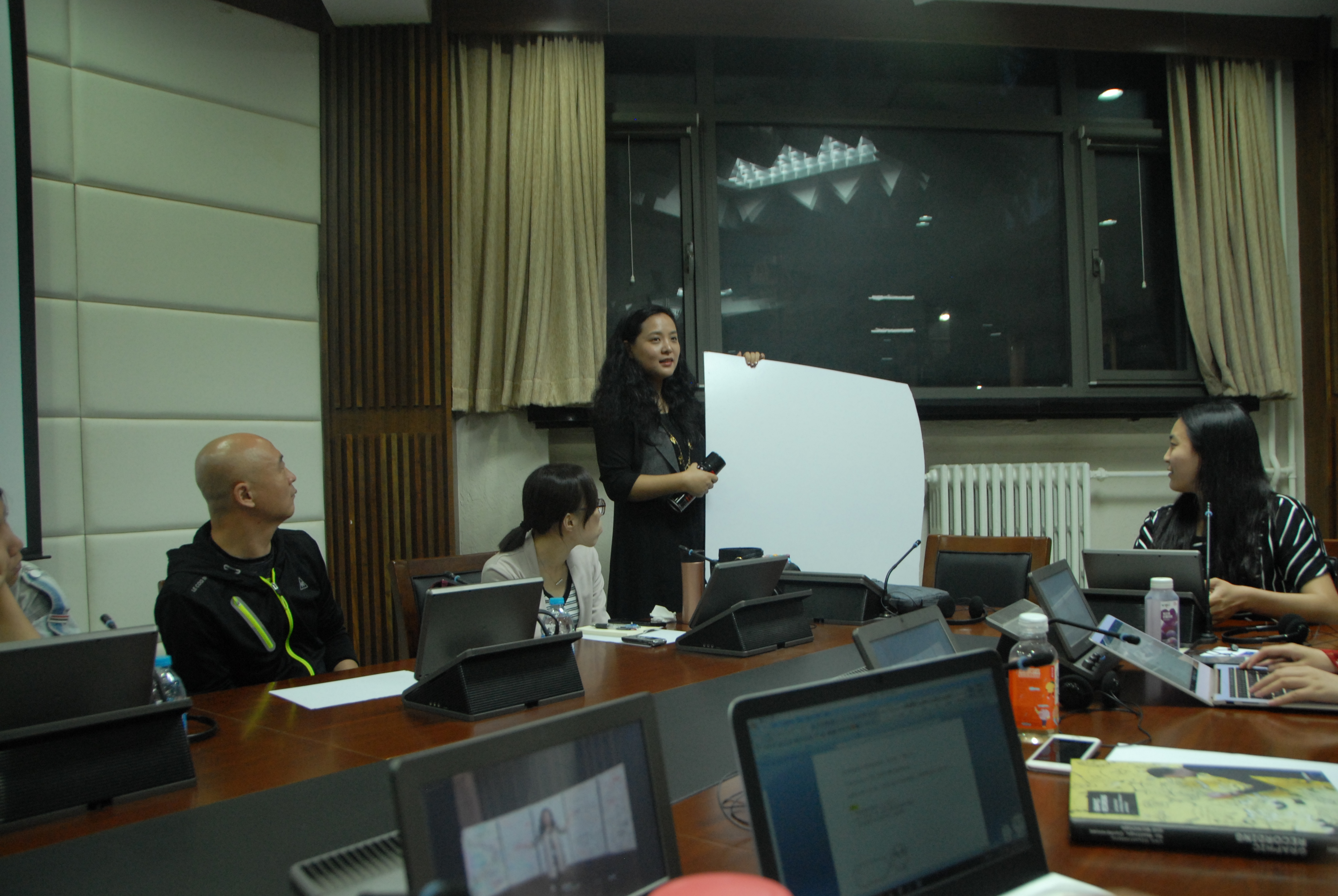 高琛展示了她工作时的一些图片,让我们直观地对视觉同传进行感受。随后,她介绍了视觉同传运用图像进行信息传递的好处。对理论介绍完毕之后,高琛为了让同学们更直观地感受视觉同传,由姚斌老师配合,进行了一次现场的视觉同传。高琛拿出平时做视觉传译的白板和画笔,进入了工作状态。模拟对话的主题是同学们对口译的问题,几位同学向姚斌老师提问,老师作答,高琛进行视觉同传。大概20分钟的问答过后,高琛很流利地直接对照板上的画和字,重复出了主要内容。同学们不仅叹服于高琛精湛的画技和记录速度,更对准确度和质量赞不绝口。